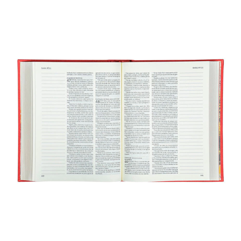 No interior, possui letra no tamanho tradicional e linguagem Almeida Corrigida Fiel (ACF), conhecida por ser uma tradução clássica que preserva toda a tradição de João Ferreira de Almeida. Nela, você encontrará ainda a fonte Leitura Perfeita. Desenvolvida exclusivamente para a Thomas Nelson Brasil, a Leitura Perfeita é uma fonte singular, moderna, bonita, clara e legível, ao mesmo tempo em que integra os melhores avanços em tipografia de bíblias modernas. O resultado é uma tipologia que traz total conforto na leitura em qualquer tamanho.