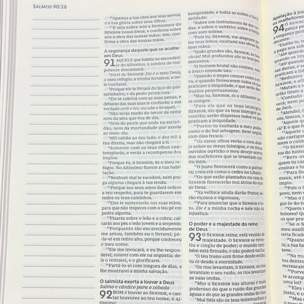 Essa Bíblia faz parte da coleção de Bíblias com espaço para anotações da Thomas Nelson Brasil, e é destinada a todos os apaixonados por lettering, colagens, anotações, aquarelas e outras formas de arte. O acabamento é de tecido sobre capa dura, que agrega um toque macio no manuseio. Ela possui papel creme (amarelado) de alta gramatura e opacidade, o que significa que você pode desenhar, escrever e pintar a vontade!