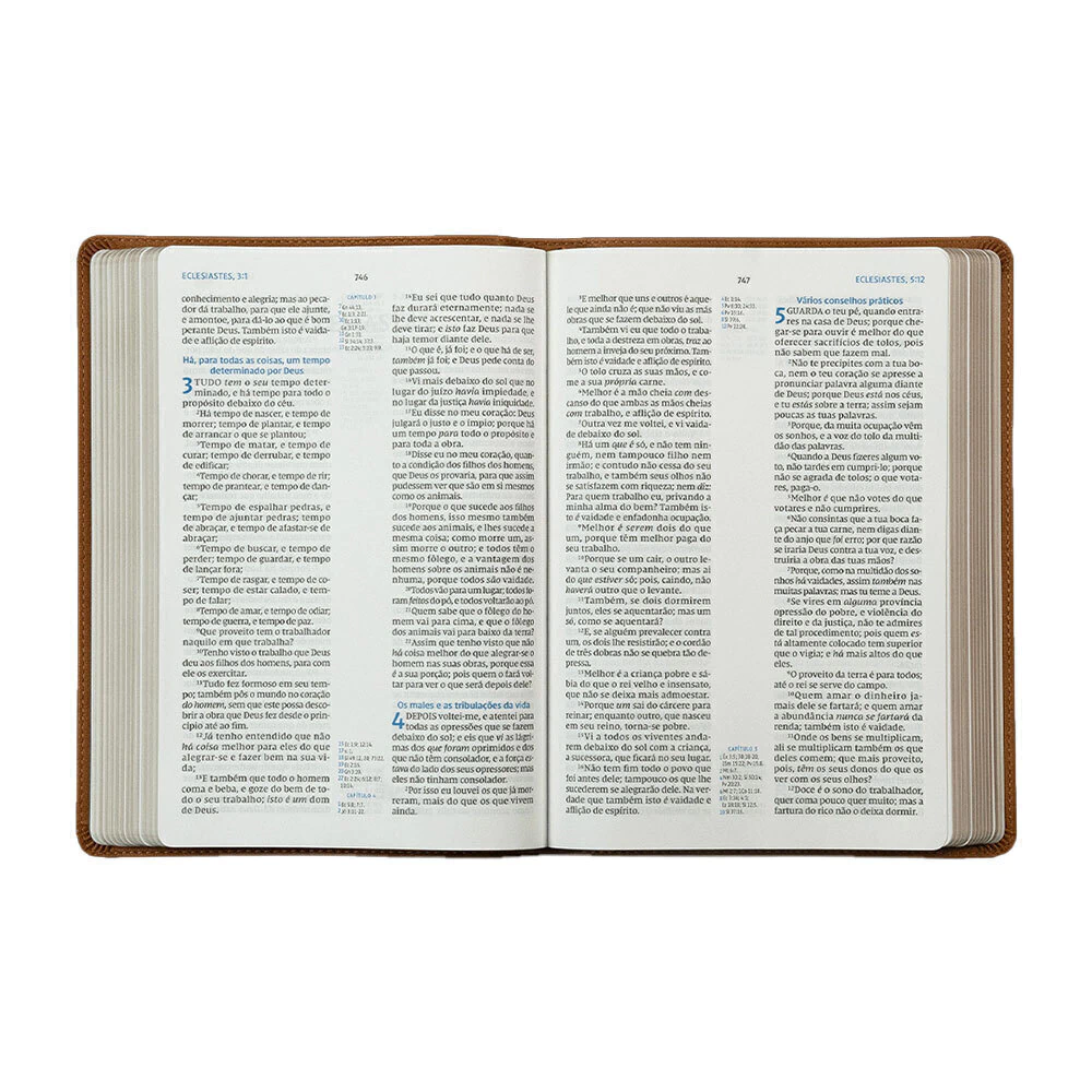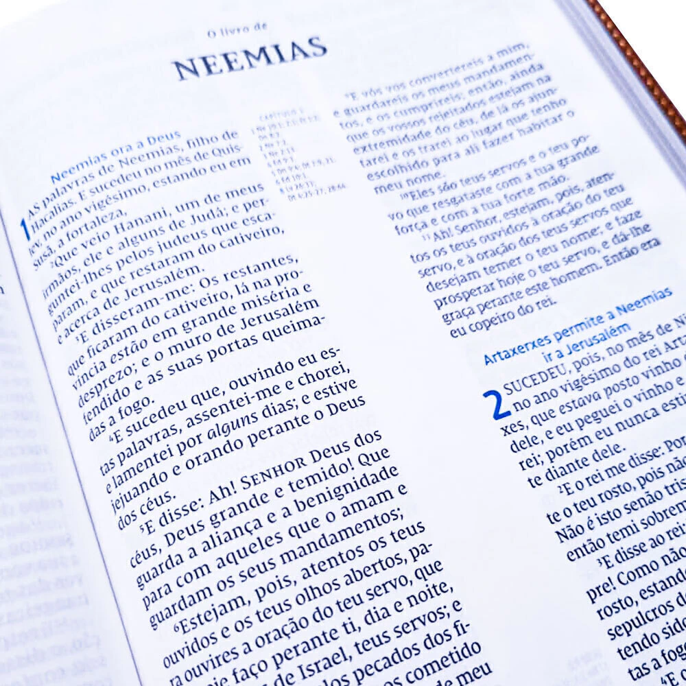 Esta Bíblia combina comodidade de leitura e beleza com recursos essenciais de pesquisa. É agradável para leitura e estudo diário, e com ela você pode acompanhar sermões e aulas de escola bíblica. Além de tudo, ela serve como um presente maravilhoso para qualquer pessoa interessada em se aprofundar na Palavra de Deus.