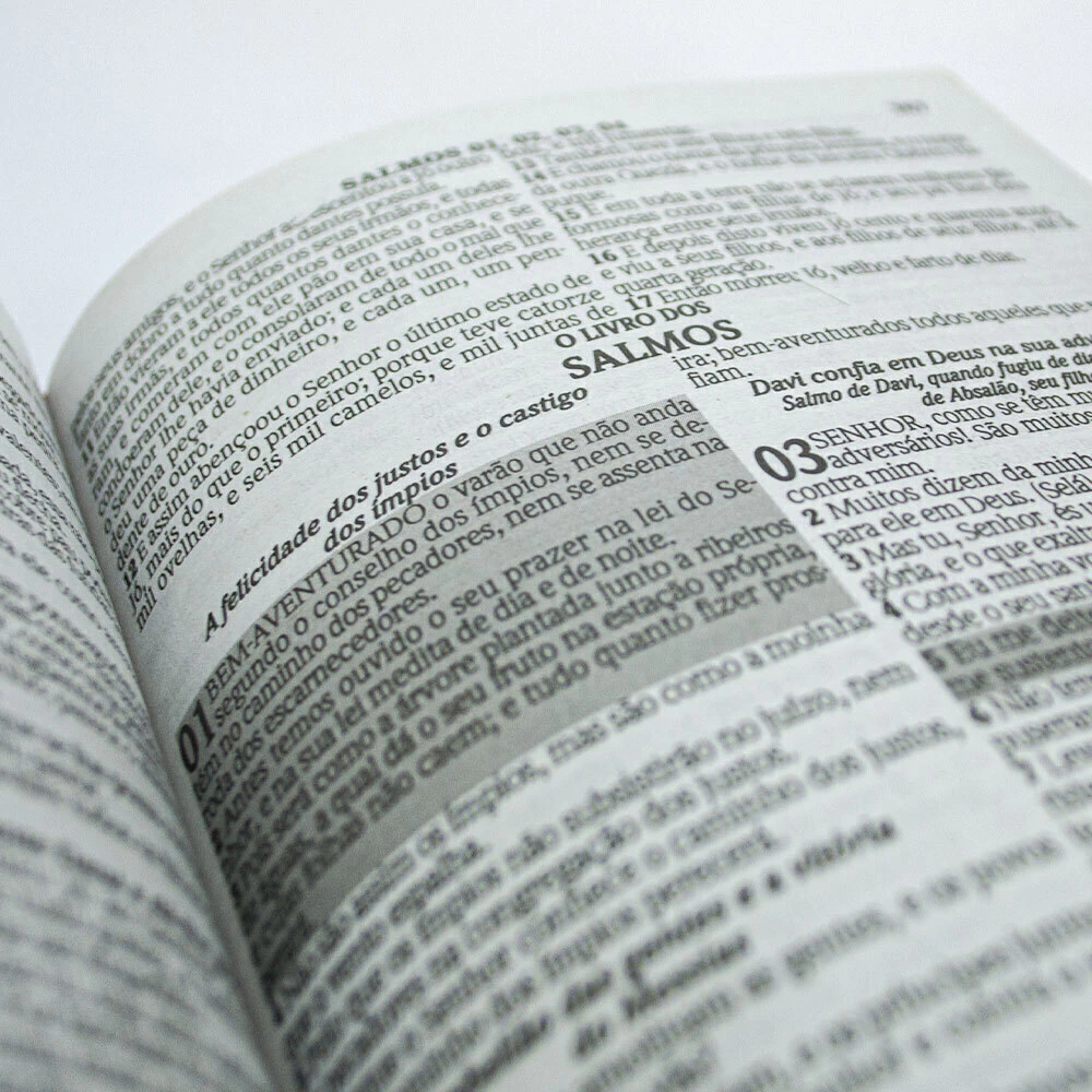 Possui índice na lateral, facilitando encontrar os livros da Bíblia rapidamente. Apresenta as Promessas destacadas em cinza e as palavras de Jesus em vermelho.