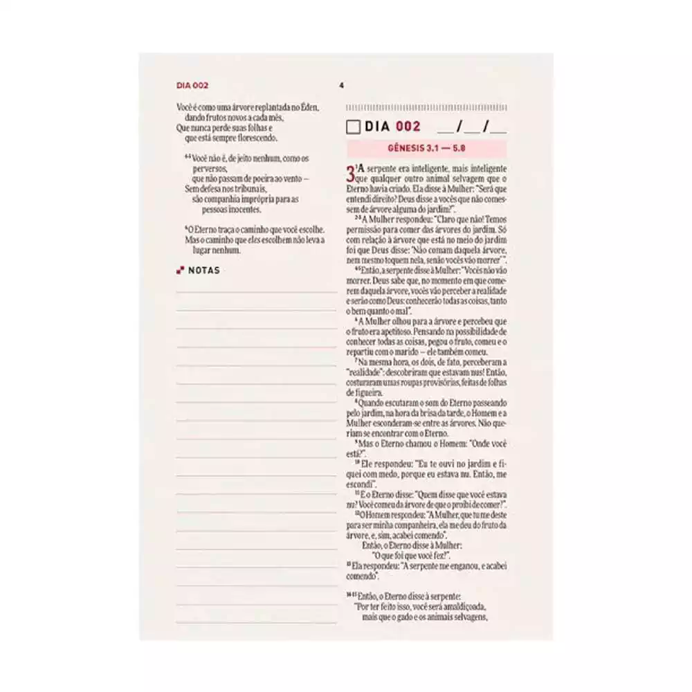 Inovadora, você encontrará, para cada dia, porções do Antigo Testamento, do Novo Testamento e de Salmos, além de um espaço para anotações ou imagens, de acordo com a sua criatividade. Você nunca leu a Bíblia assim antes!