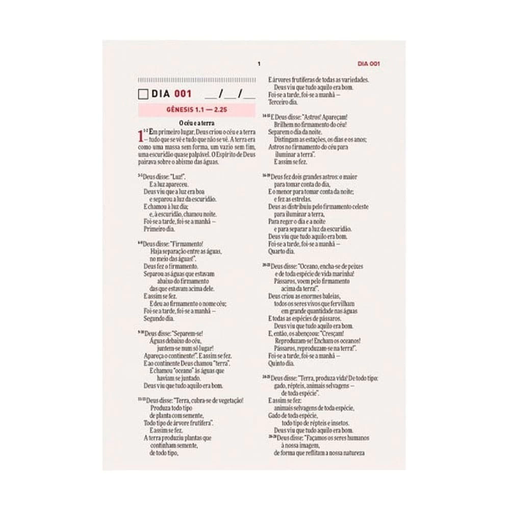 Inovadora, você encontrará, para cada dia, porções do Antigo Testamento, do Novo Testamento e de Salmos, além de um espaço para anotações ou imagens, de acordo com a sua criatividade. Você nunca leu a Bíblia assim antes!
